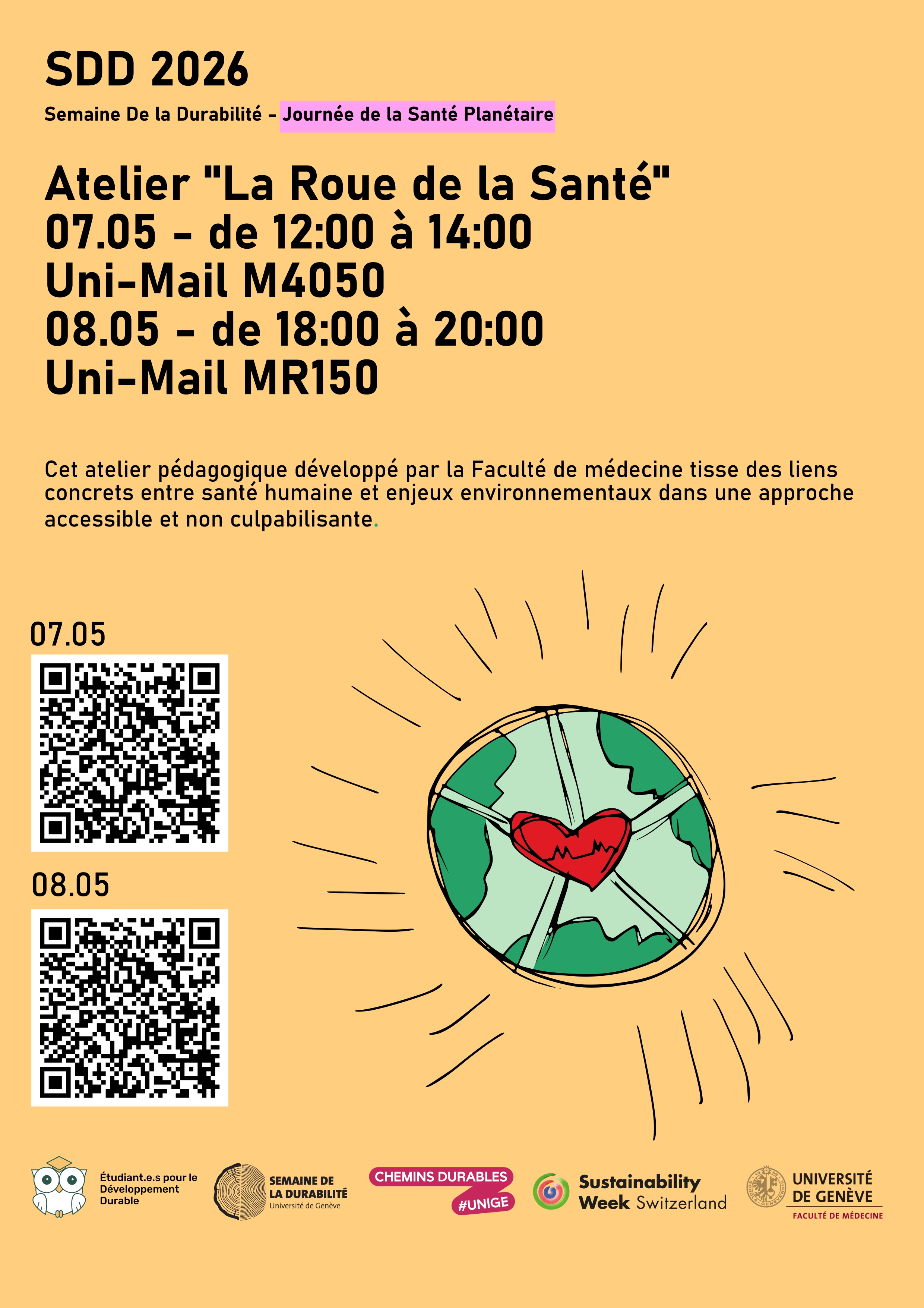 La Roue de la Santé est un atelier pédagogique développé par la Faculté de médecine de l'Université de Genève. À travers les déterminants de la santé, il tisse des liens concrets entre santé humaine et enjeux environnementaux, dans une approche accessible et non culpabilisante.