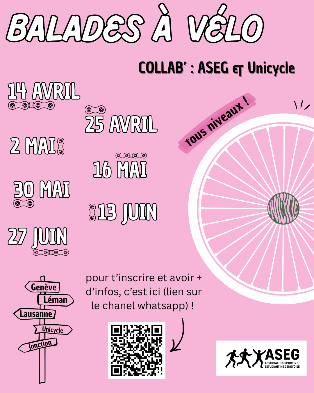 Unicycle et la toute nouvelle association sportive de l’UNIGE, l’Association Sportive Estudiantine des Hautes Écoles Genevoises (ASEG), s’associent pour vous proposer des balades à vélo conviviales 🚴♀️